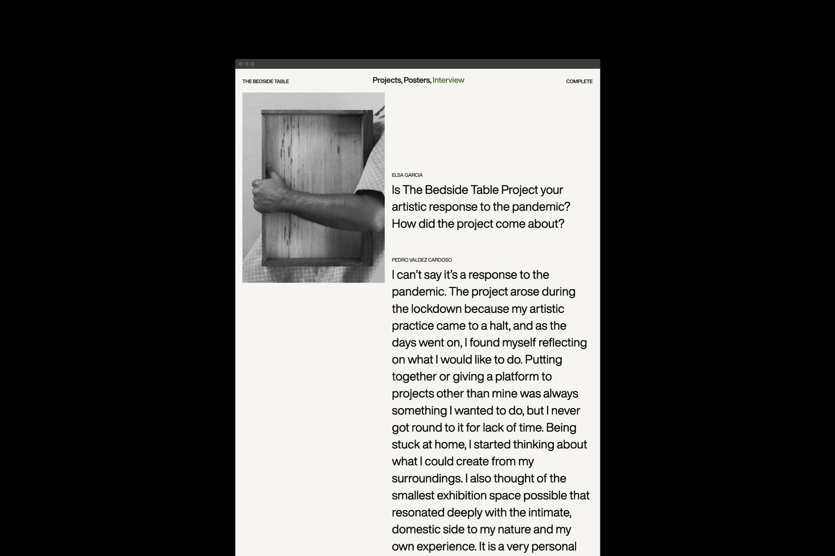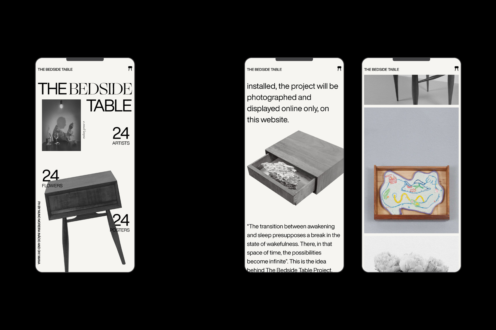 The Bedside Table Project, conceived by the artist Pedro Valdez Cardoso which grants several artists the opportunity to make use of one of the most intimate spaces that we have in our homes: the drawer of the bedside table.