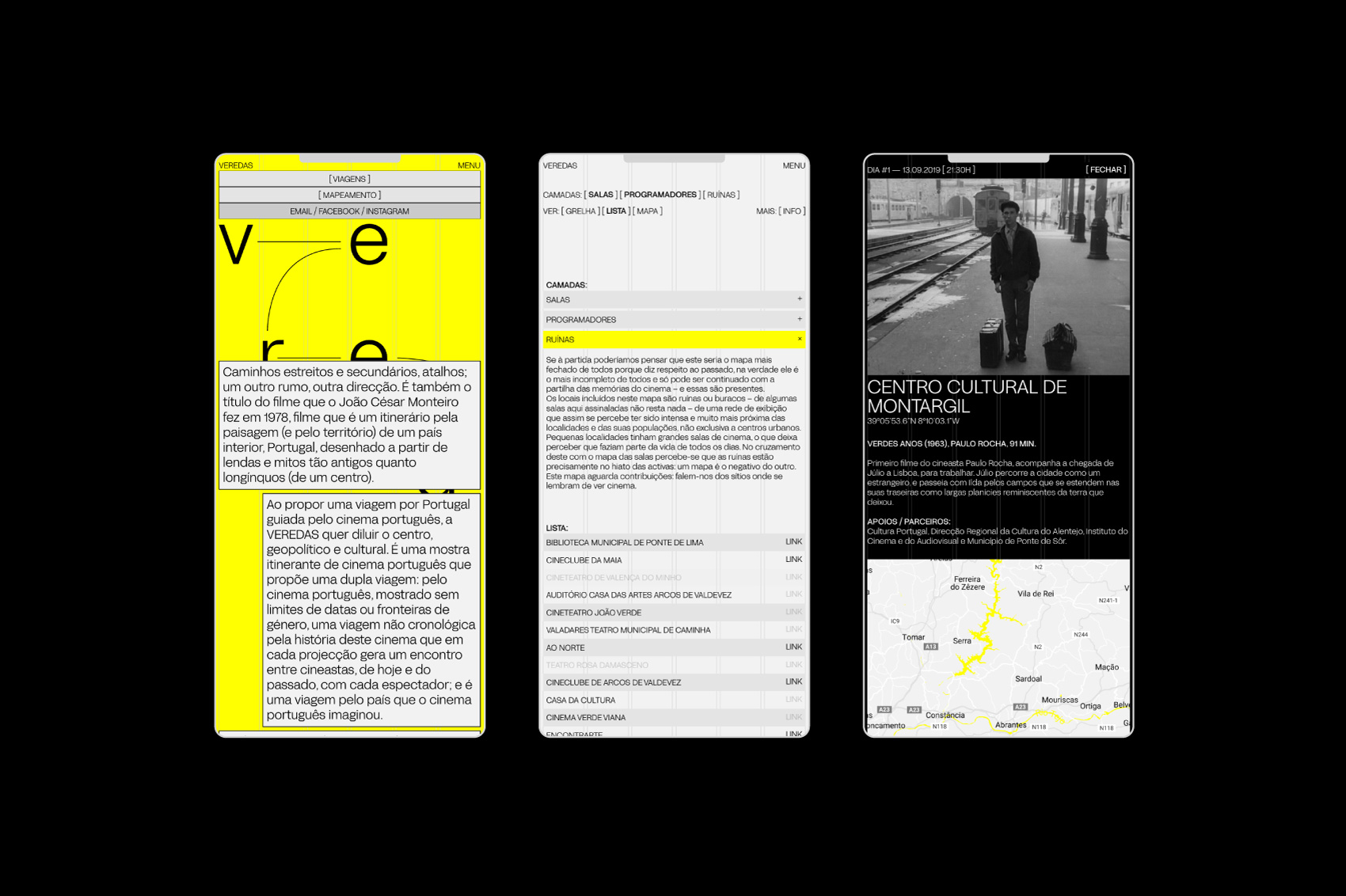 Veredas is an itinerant exhibition of Portuguese cinema that proposes a double journey: through Portuguese cinema, shown without limits of dates or genre boundaries and is a journey through the country that Portuguese cinema